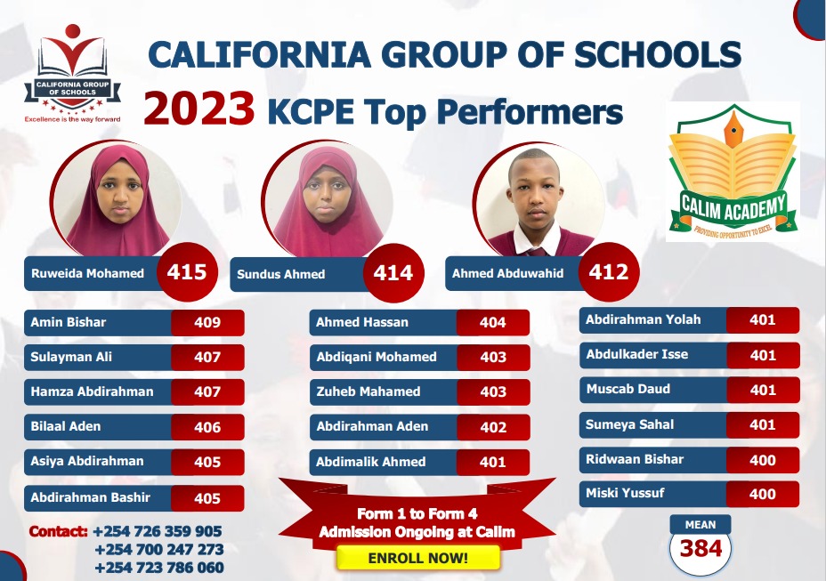 Our Grade 8 learners from Calim Academy posted phenomenal scores in the 2023 KCPE exams, with top scorers including: