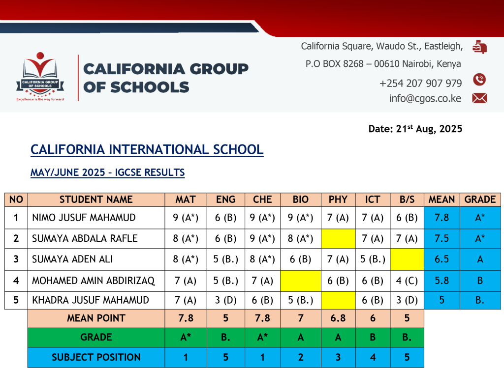 At California International School (CIS), excellence is not an accident—it is a culture. Our consistent IGCSE performance continues to place us among the leading schools in Nairobi and Kenya at large. These results serve as a standard by which parents, fellow schools, and the wider community measure us.